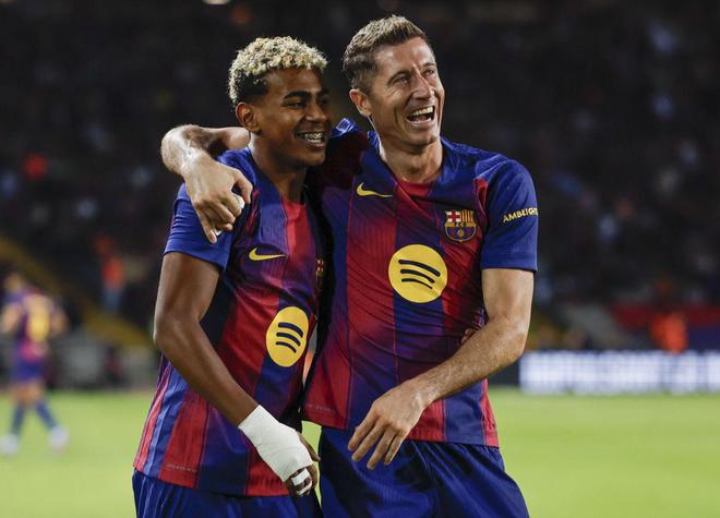 上半场结束前,巴萨发出角球,拉什福德助攻孔德头球攻门。巴萨1-1,双方重回同一起跑线。下半场,巴萨再接再厉。第59分钟,亚马尔右路突破后传中,莱万在中路头球攻门,球打在立柱上入网,2-1!
