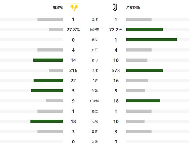 第68分钟维罗纳利用角球机会,再次攻破尤文球门,不过主裁判回看VAR后,取消了这一粒进球,接下来的时间,两支球队都没有能够再次改写比分,最终激战90分钟握手言和各得1个积分。