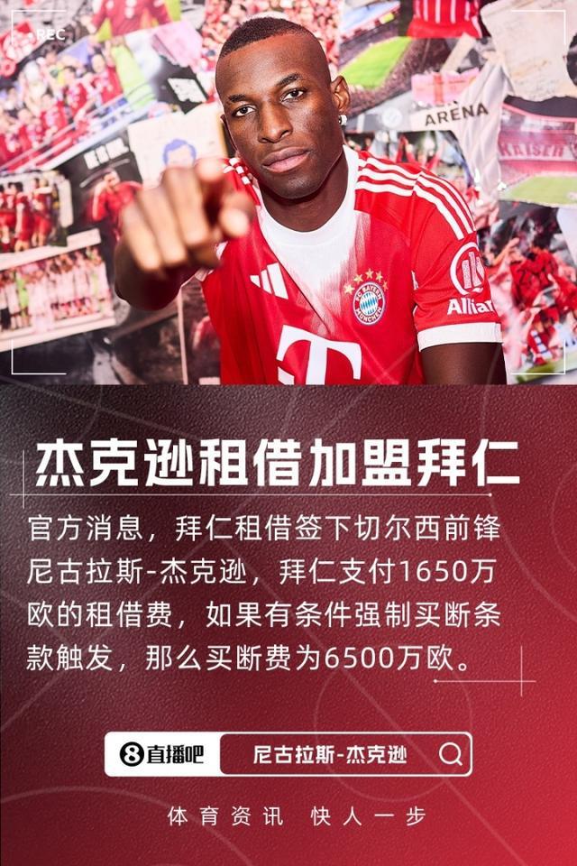 切尔西前锋杰克逊租借加盟拜仁,据悉租借费1650万欧元,有条件的强制买断费用6500万欧元。
